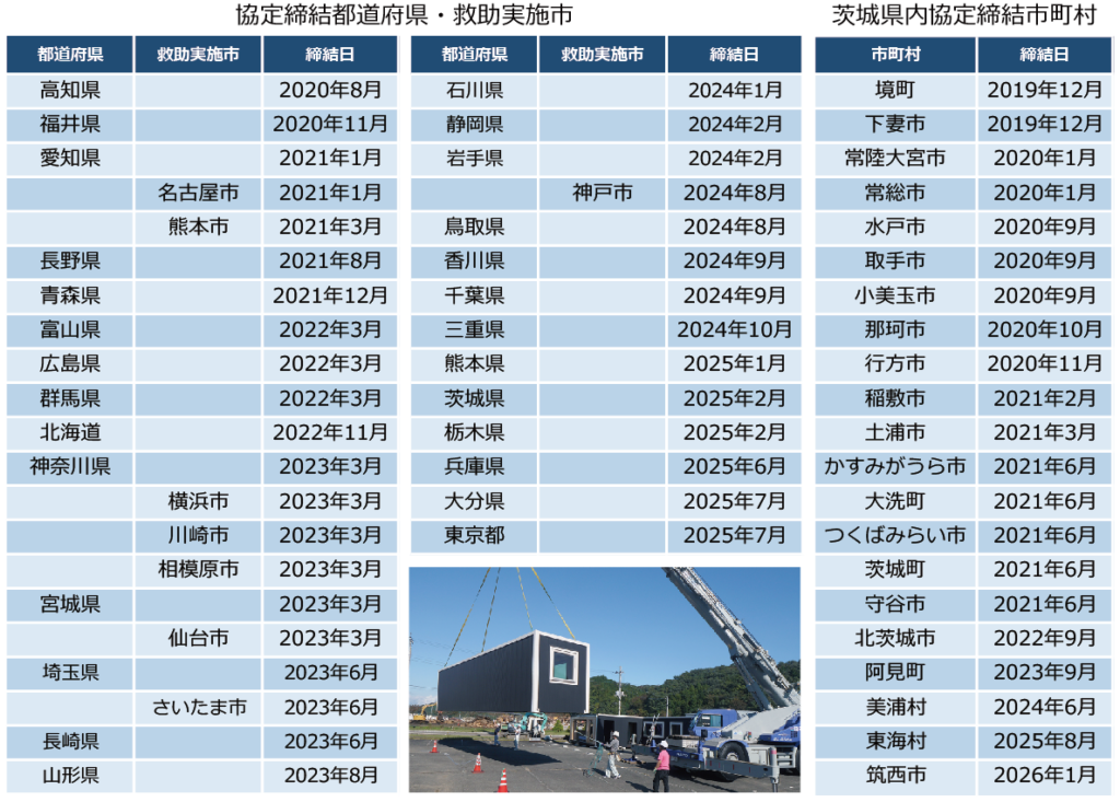 日本ムービングハウス協会は、動く木造建築物という独自の技術を、日本全国へ普及させ、地域社会の発展に貢献することを使命として、2016年3月に設立されました。現在では参加企業が約70社にまで広がり、今後も増加が見込まれています。その活動は着実に自治体からの信頼を積み重ねており、災害時におけるムービングハウス建設に関する協定を結んだ自治体は、全国で220に達しています。今回の筑西市との締結により、茨城県内では21自治体目となりました。